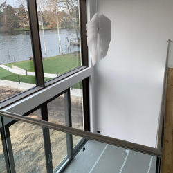 Fensterfront ist mit braunen Alu-Schiebeelementen versehen, die in